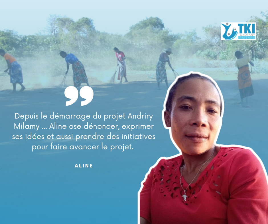 Depuis le démarrage du projet Andriry Milamy, la présence et la participation assidue d'Aline ont été remarquées par tou·tes les participant·es. Aline ose dénoncer, exprimer ses idées et aussi prendre des initiatives pour faire avancer le projet. Les formations, sur les thématiques liées à la communication non-violente et la gestion de conflit, dispensées par l’ONG Tokotany Iraisana l'ont beaucoup marquée. Depuis, elle s'est engagée au niveau de sa communauté pour sensibiliser sur les droits des femmes, un sujet qui lui tient particulièrement à cœur. Actuellement, son leadership est reconnu, elle a été élue Présidente de l'Association des femmes du 08 mars dans la commune de Marotsiraka.